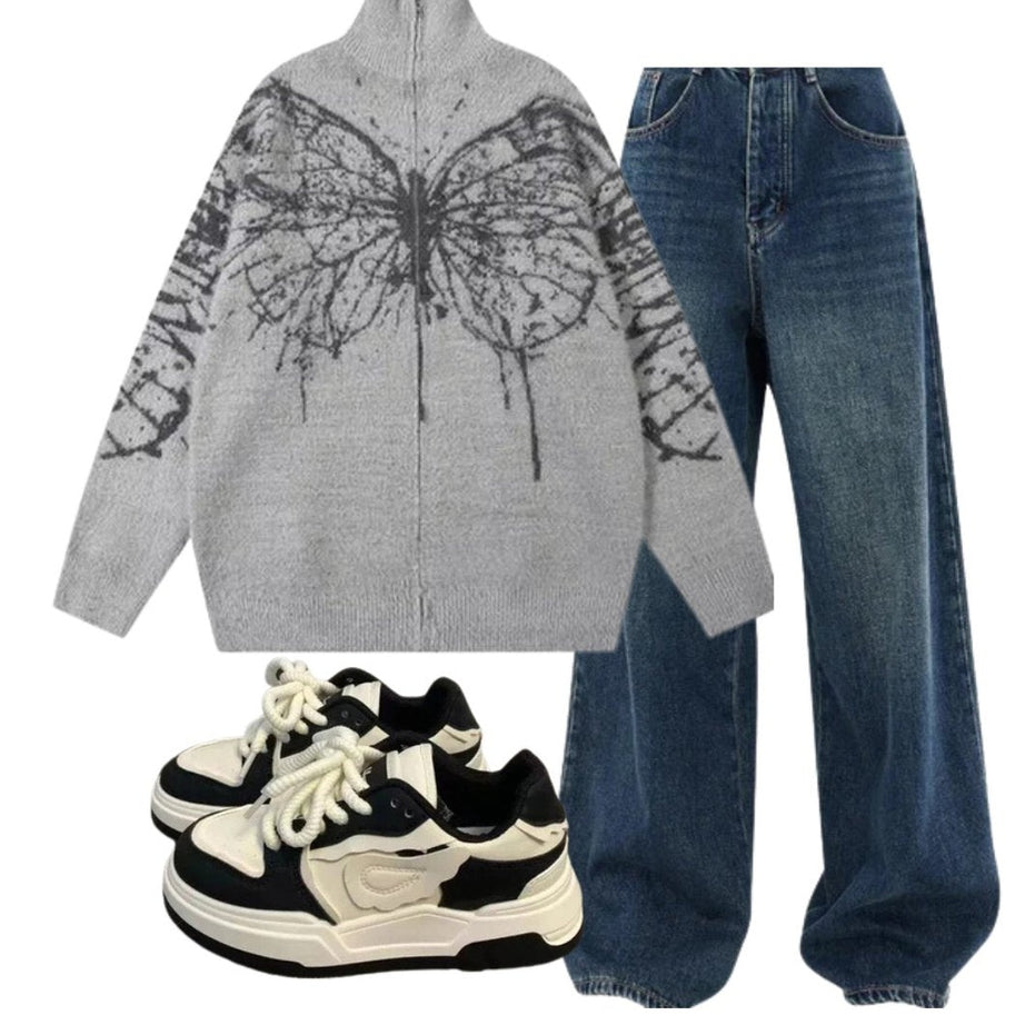 Y2k Outfit: Oversized Dark Wash Wide-Leg Jeans+Oversized Butterfly Grunge Sweater+Pastel Dream Wave Sneakers