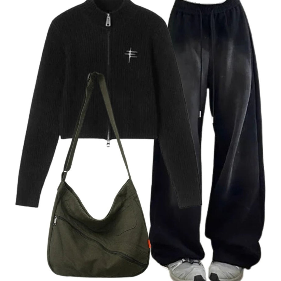 Y2k Outfit: Ribbed Zip-Up Turtleneck Sweater+Baggy Y2K Grunge Sweatpants+Cotton Large Capacity Shoulder Bag