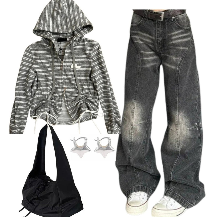 Y2k Outfit: Striped Cozy Zip-Up Hoodie+Washed Black Wide-Leg Jeans+Fashionable Black Nylon Bucket Handbag+Earrings
