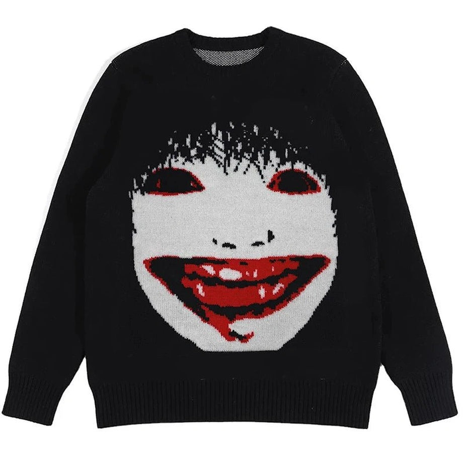Ce pull noir présente un graphique de visage audacieux et troublant avec une palette de couleurs rouge et blanc effrayante, parfait pour faire une déclaration dans des styles gothiques ou inspirés de l'horreur. Ce pull combine l'esthétique sombre avec une ambiance énervée et obsédante idéale pour les amateurs de mode alternatifs.
