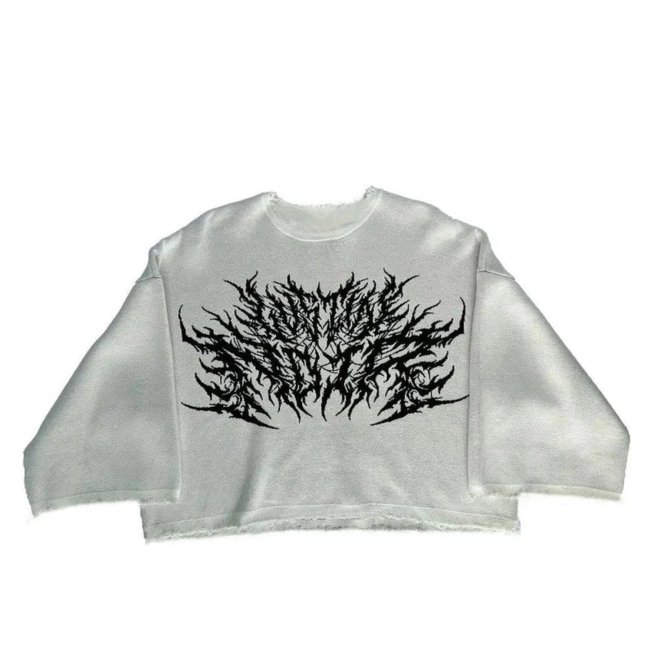 Ce pull radieux noir présente un graphique d'inspiration audacieux, évoquant une esthétique gothique et grunge. Parfait pour les tenues alt et énervées, son design en détresse ajoute une touche rebelle à toute garde-robe.