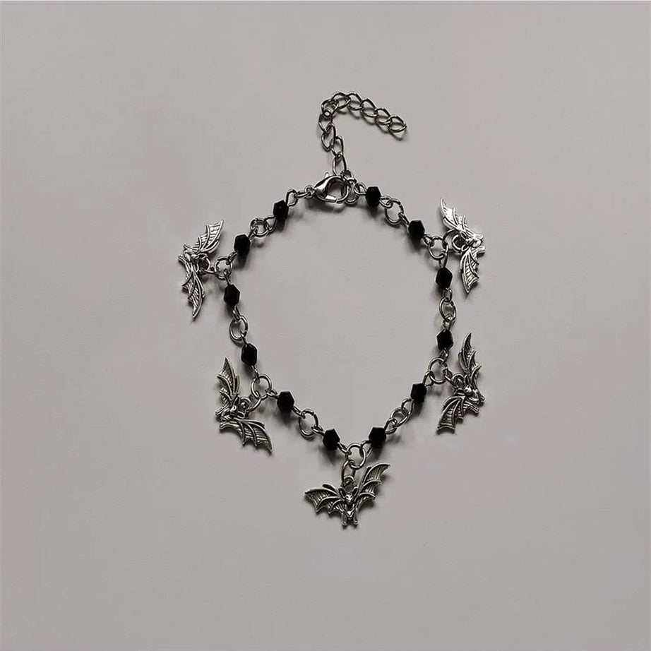 Ce bracelet gothique présente des charmes de chauve-souris en argent et des perles noires, créant un accessoire sombre et énervé parfait pour ajouter une touche d'attrait nocturne à votre look. Idéal pour les styles gothiques, emo ou alternatifs.