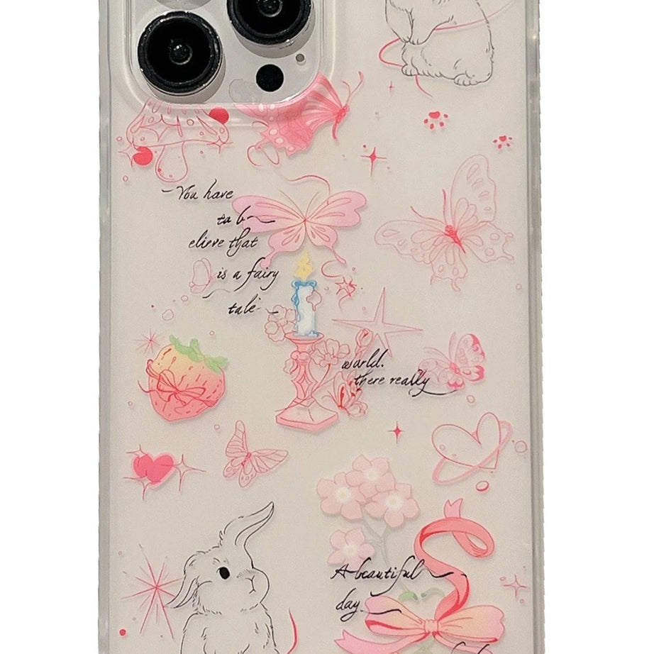 Orné de papillons, de cerises et de lapins rêveurs, cet étui rose clair apporte une douce fantaisie à votre style quotidien.