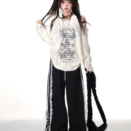 Ce haut gris râpé avec des détails en détresse présente un texte graphique et gothique audacieux, parfait pour le grunge et l'esthétique énervée. La coupe à épaules éteintes et le design en couches avec des accents de chaîne ajoutent une touche rebelle, ce qui le rend idéal pour les amateurs de mode alternatifs.