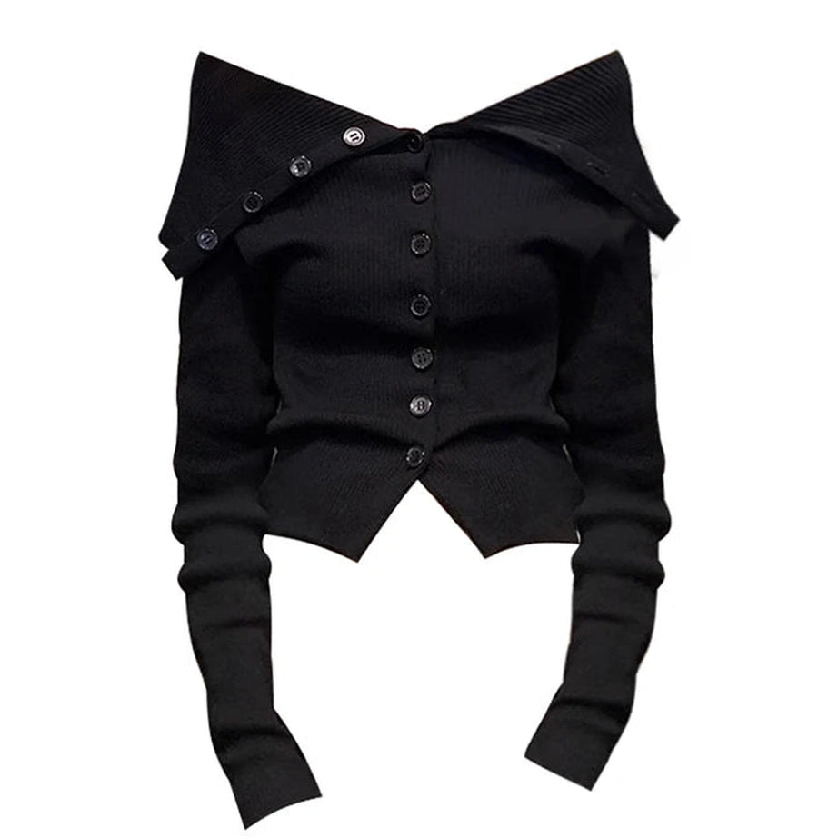 Ce cardigan noir frappant à épaules dénuées présente une conception boutontricale asymétrique, ce qui lui donne une ambiance élégante et énervée. Parfait pour l'esthétique Goth et Dark Academia, il ajoute une touche audacieuse mais raffinée à n'importe quel look.