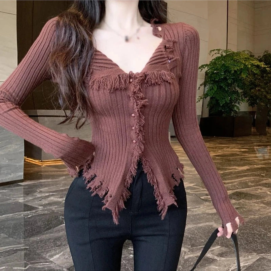 Ce cardigan côtelé unique présente des ourlets effilochés et un look en détresse, ajoutant une touche de nervosité à la conception boutonnée classique. La ligne en V profonde en V et la silhouette ajustée le rendent parfait pour s'associer à un pantalon ou à des jupes à taille haute. Idéal pour une tenue élégante et alternative avec un soupçon d'influence universitaire sombre.