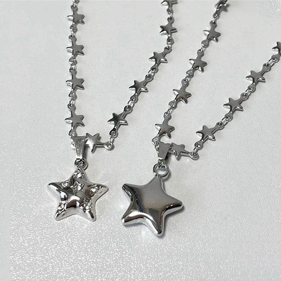 Orner de l'élégance du ciel nocturne avec ces colliers d'étoiles argentés. Avec de délicats liens en forme d'étoile et un pendentif étoile étincelant, ces colliers sont parfaits pour ajouter une touche de charme céleste à toute tenue. Idéal pour ceux qui aiment l'esthétique Angelcore et Lovecore, ces pièces apportent un soupçon de magie et de romance à votre style.
