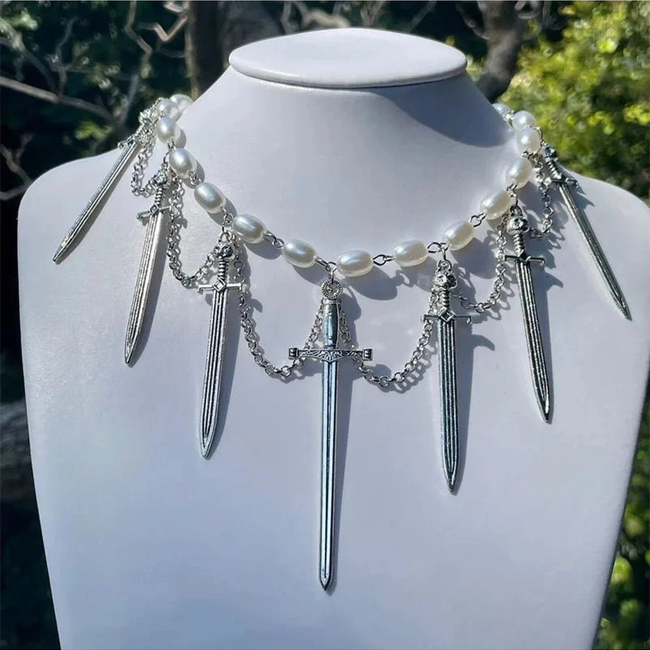 Ce tour de cou frappant mélange l'élégance avec Edge, avec des pendentifs à l'épée en argent et des accents de perles délicats. Parfait pour ceux qui cherchent à ajouter une touche d'esprit guerrier à leur style goth ou alternatif.
