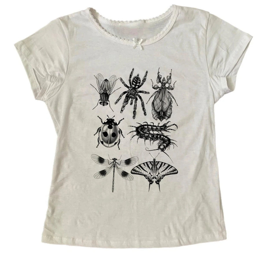 Cet tee bébé unique présente des illustrations détaillées et monochromatiques d'insectes, ajoutant une ambiance énervée et légèrement étrange. Parfait pour l'esthétique Goth et Dark Academia, c'est une pièce idéale pour les amoureux de la nature avec une touche sombre.
