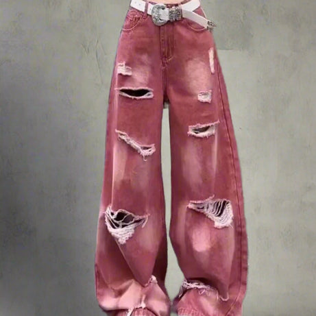 Ces jeans roses en détresse inspirés de l'inspiration rétro présentent un ajustement ample et ample avec des jambes larges et une série de déchirures audacieuses pour un bord grunge. Parfait pour un retour en arrière des années 90 ou un look de streetwear alternatif, ces jeans ajoutent une touche de couleur et de personnalité à n'importe quelle tenue.