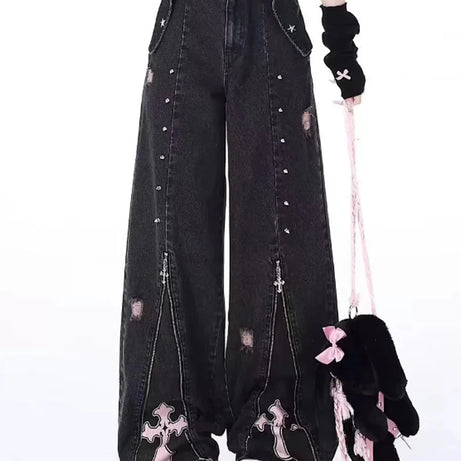 Entrez dans le côté obscur de la mode avec ces jeans larges d'inspiration gothique, avec des patchs croisés, des détails d'étoiles et des éléments en détresse. Parfait pour ajouter une ambiance audacieuse et énervée à votre garde-robe punk ou grunge.