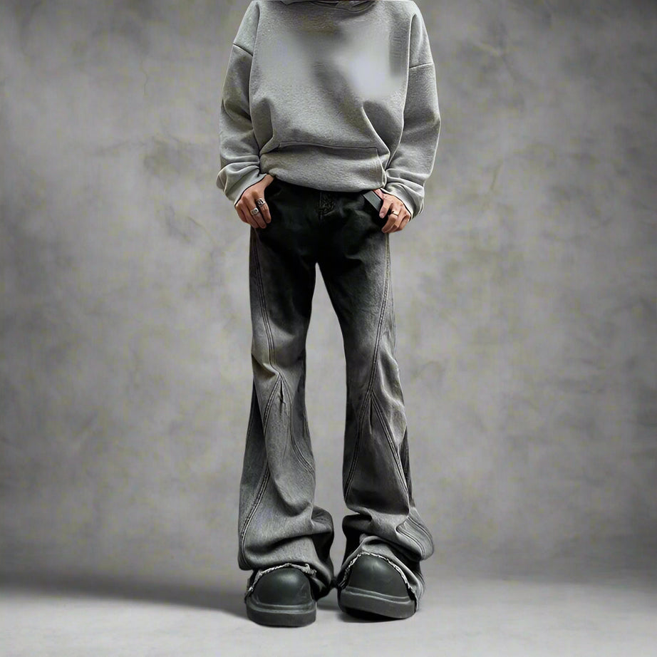 Entrez sous les projecteurs avec ces jeans évasés audacieux avec des ourlets divisés dramatiques et un lavage de gradient de charbon de bois frappant. La conception du panneau énervé et le canal d'ajustement à jambes larges est une esthétique grunge inspirée des années 90. Associez-vous à de grosses baskets et à un crop top pour un look hors concours.