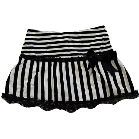Cette mini-jupe à rayures en noir et blanc présente une esthétique gothique audacieuse avec une délicate garniture en dentelle et un accent d'arc. Parfait pour les tenues universitaires d'inspiration grunge ou sombres, il offre un mélange unique de style énervé et féminin.