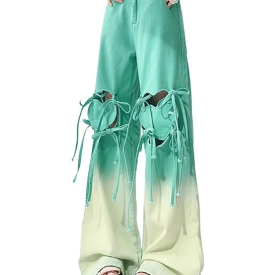 Ces pantalons Ombre Green Green présentent des découpes audacieuses avec des détails d'arc à lacets, créant un look frappant et ludique. Avec un ajustement large et un gradient dynamique, ils sont parfaits pour ajouter une esthétique pastel unique à n'importe quelle tenue.