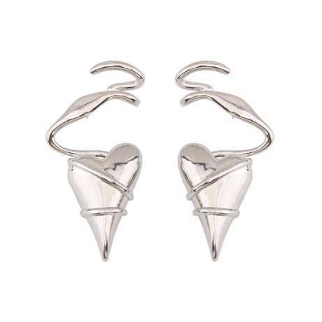 Boucles d'oreilles en argent audacieuses en forme de cœurs à pointes enroulés dans une bande torsadée, parfaites pour les expressions de style punk, emo et alternatif.