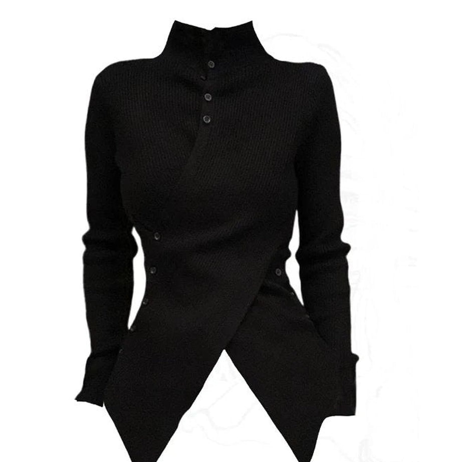 Ce pull élégant et à col haut dispose d'un design enveloppant asymétrique avec des détails de bouton pour une silhouette frappante. Parfait pour ajouter une touche gothique ou énervée à votre garde-robe, il mélange la structure et le style dans un haut en tricot unique.