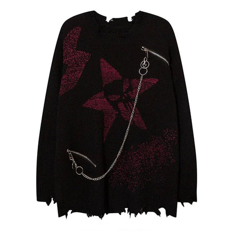 Ce pull noir se démarque avec des graphiques étoiles rouges audacieux, des détails à la fermeture à glissière énervés et des chaînes de métal suspendues pour une ambiance rebelle. L'ourlet en détresse et le design d'inspiration punk le rendent parfait pour ajouter une déclaration à votre garde-robe grunge ou alt, à s'associer sans effort avec un jean déchiré et des bottes de combat.