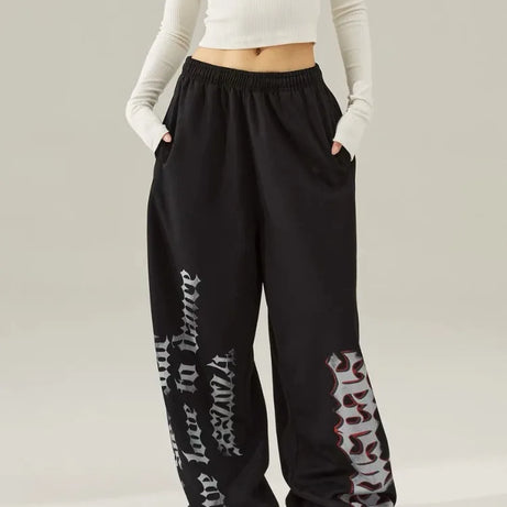 Ce pantalon de survêtement noir présente un texte gothique audacieux et des graphismes de flammes, alliant confort et côté rebelle pour une esthétique gothique de rue remarquable.