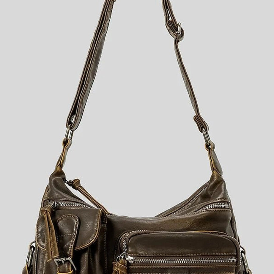 Ce sac à bandoulière multi-poche robuste comprend un look en cuir en détresse et des détails de fermeture à glissière fonctionnelle. Son design polyvalent est parfait pour ceux qui ont une esthétique vintage ou boho, combinant le style avec la praticité des aventures de tous les jours.