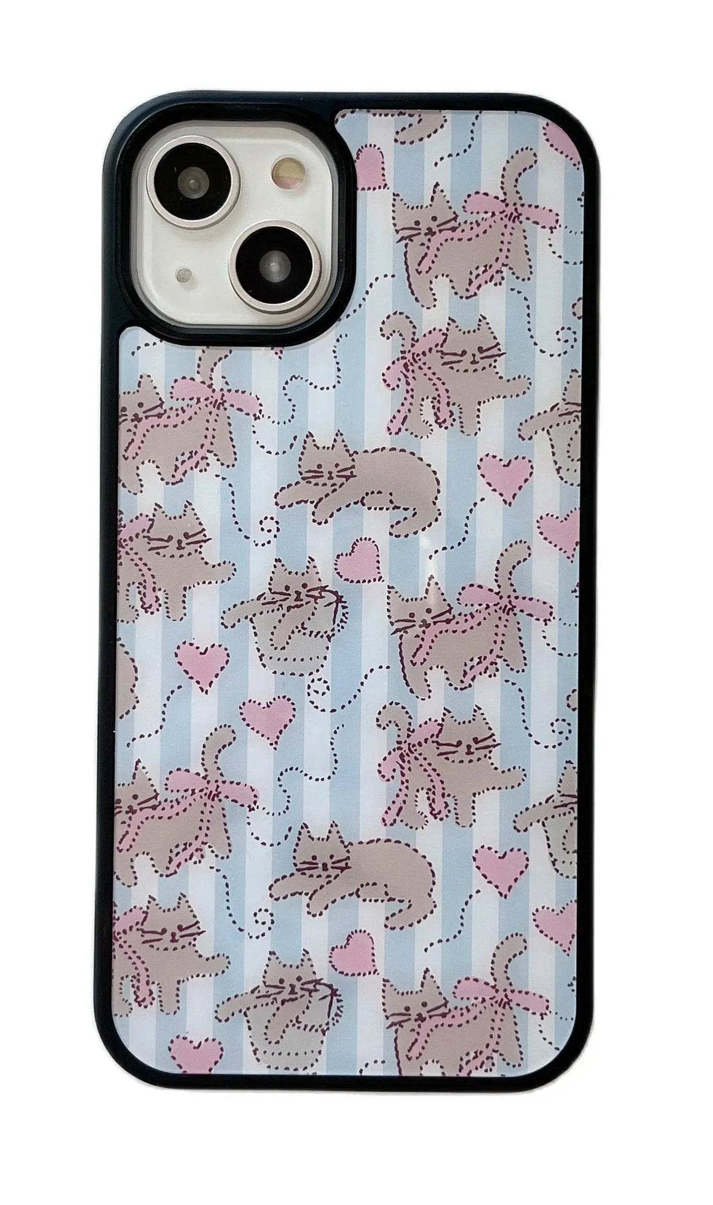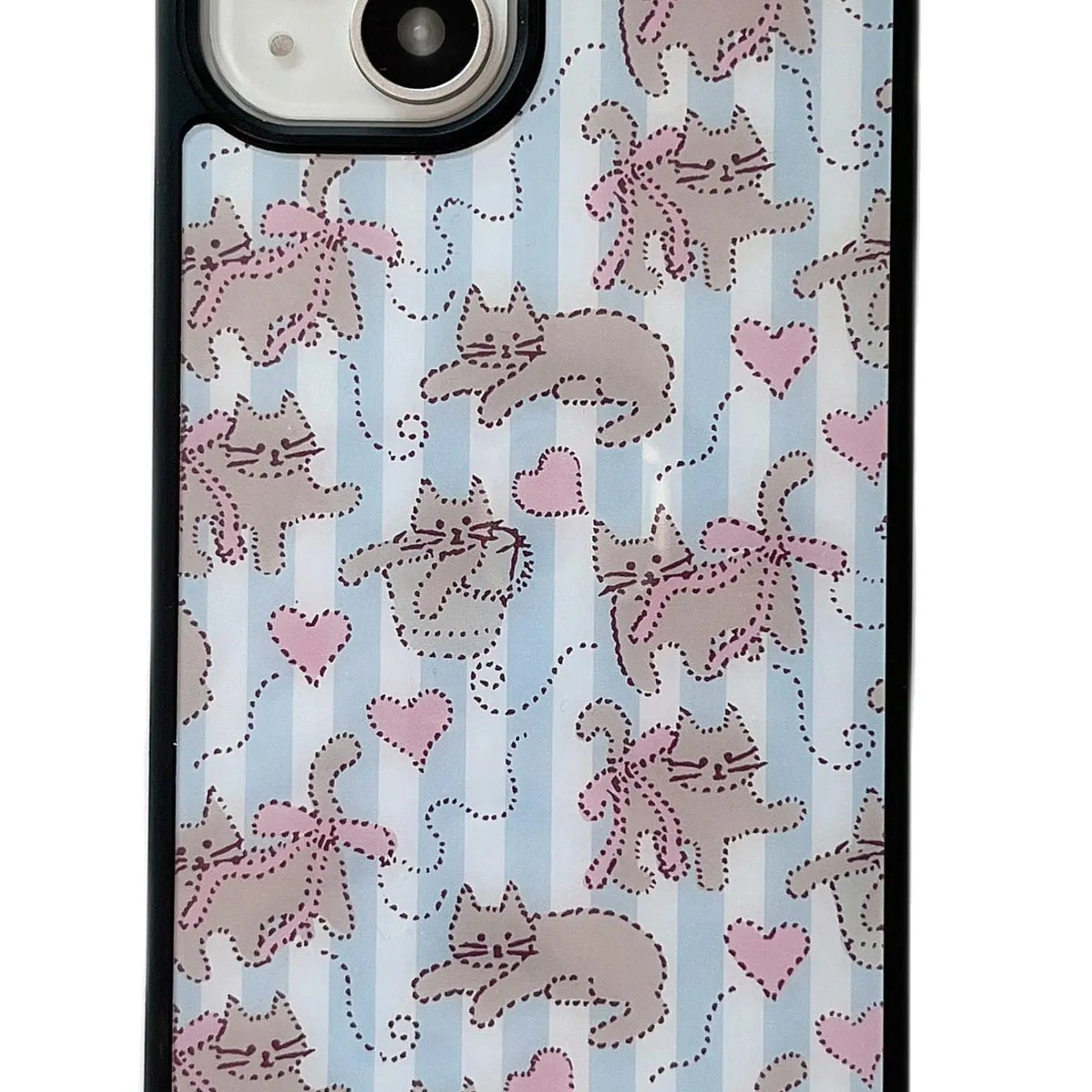 Cette coque de téléphone à rayures douces présente des chats et des cœurs de style cousu dans des tons pastel doux, parfaite pour une esthétique douce et mignonne.
