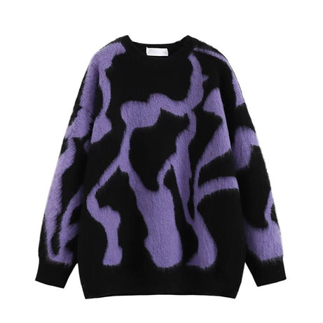 Ce pull noir surdimensionné présente des motifs violets audacieux et abstraits avec une texture floue. Son ambiance grandiose et grunge est parfaite pour ceux qui aiment un mélange d'esthétique alt et pastel goth, ce qui en fait une pièce hors concours pour les looks de street-strewear aux temps cool.