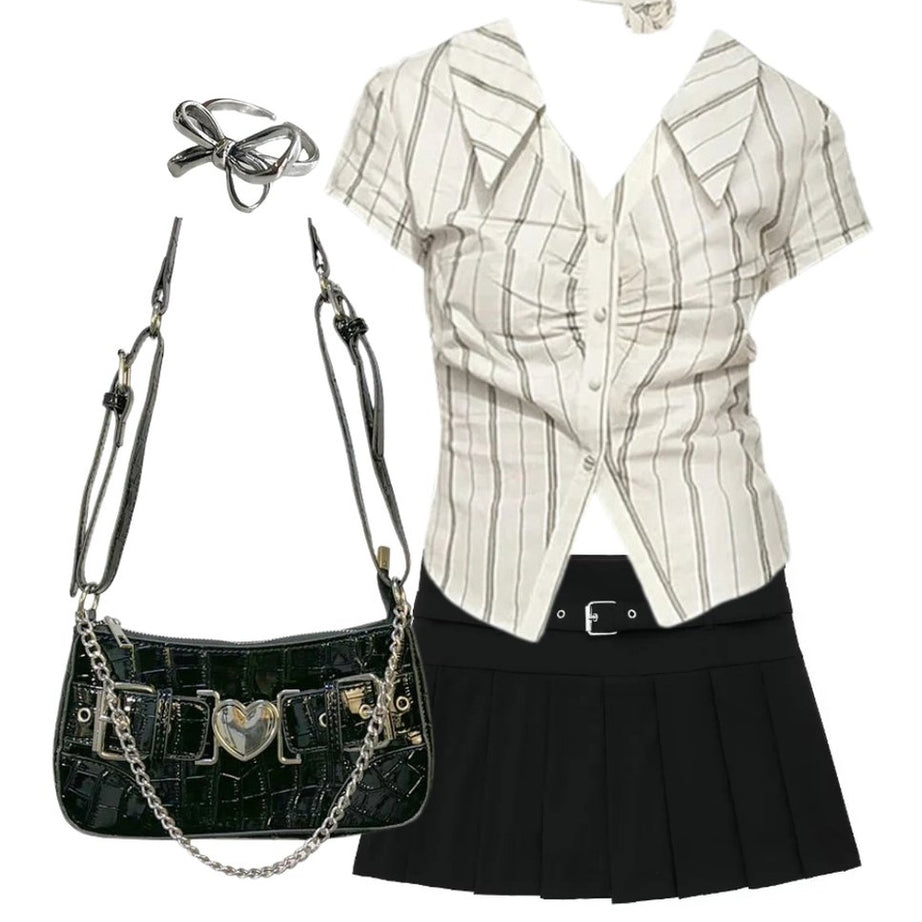 Tenue: Blouse de bureau à bande élégante + jupe à glissière courte chic Automne + sac à corps croisé en chaîne + bague