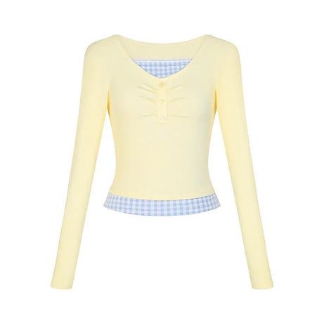 Ajoutez une touche de douceur à votre garde-robe avec ce haut à manches longues jaune doux, avec une charmante ligne en V et des détails de bouton subtils. L'ourlet en vichy bleu superposé ajoute une ambiance de coquette preppy, ce qui le rend parfait pour les universités légers et les tenues inspirées du pastel. Stylez-le avec des jupes ou des jeans à taille haute pour un look frais et ludique.