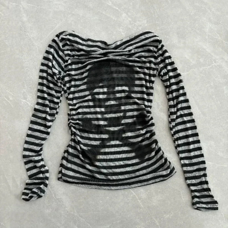 Ce haut à épaules dénué à rayures dispose d'une impression de visage sombre frappante et de détails frontière. Parfait pour l'esthétique grunge et alt, il ajoute un avantage audacieux et mystérieux à toute tenue.