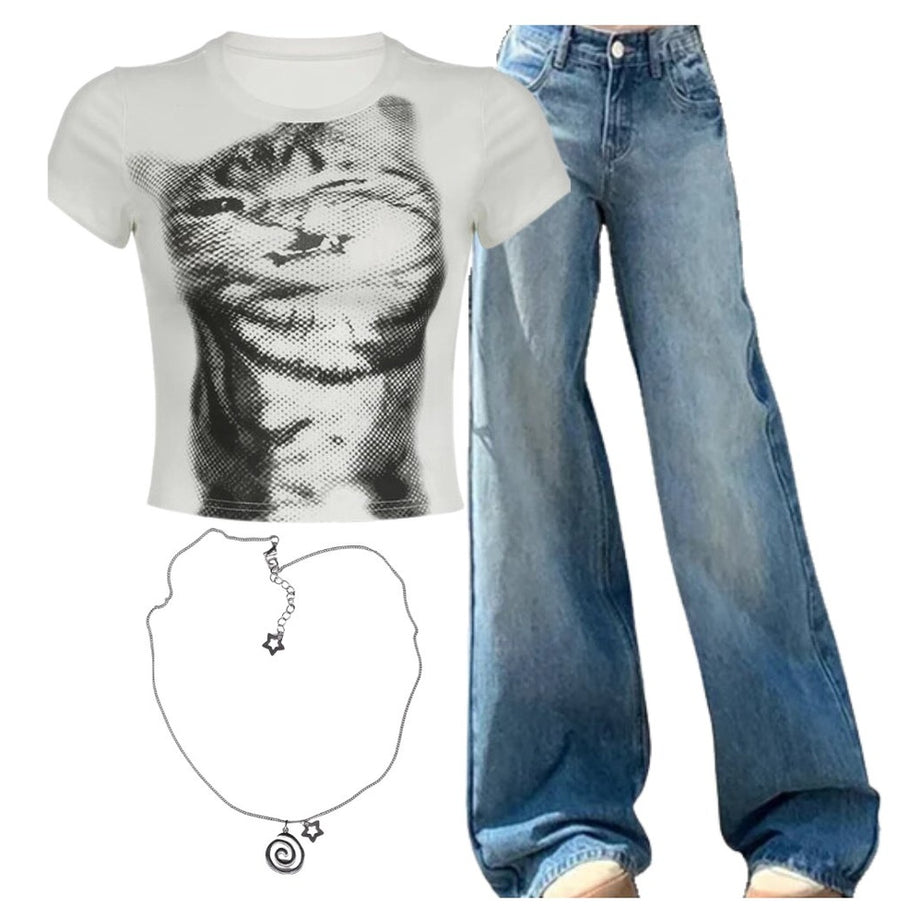 Y2K Tenue: Cat graphique Pixelated Cat Top + lavage léger Denim à jambes larges + Vortex Colliers punk