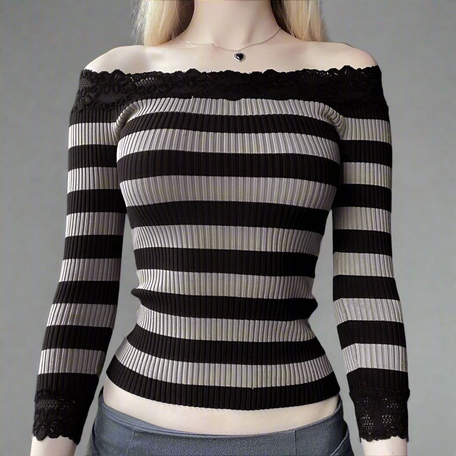 Midnight Stripes Lace Trim Alt Long Sleeve Top